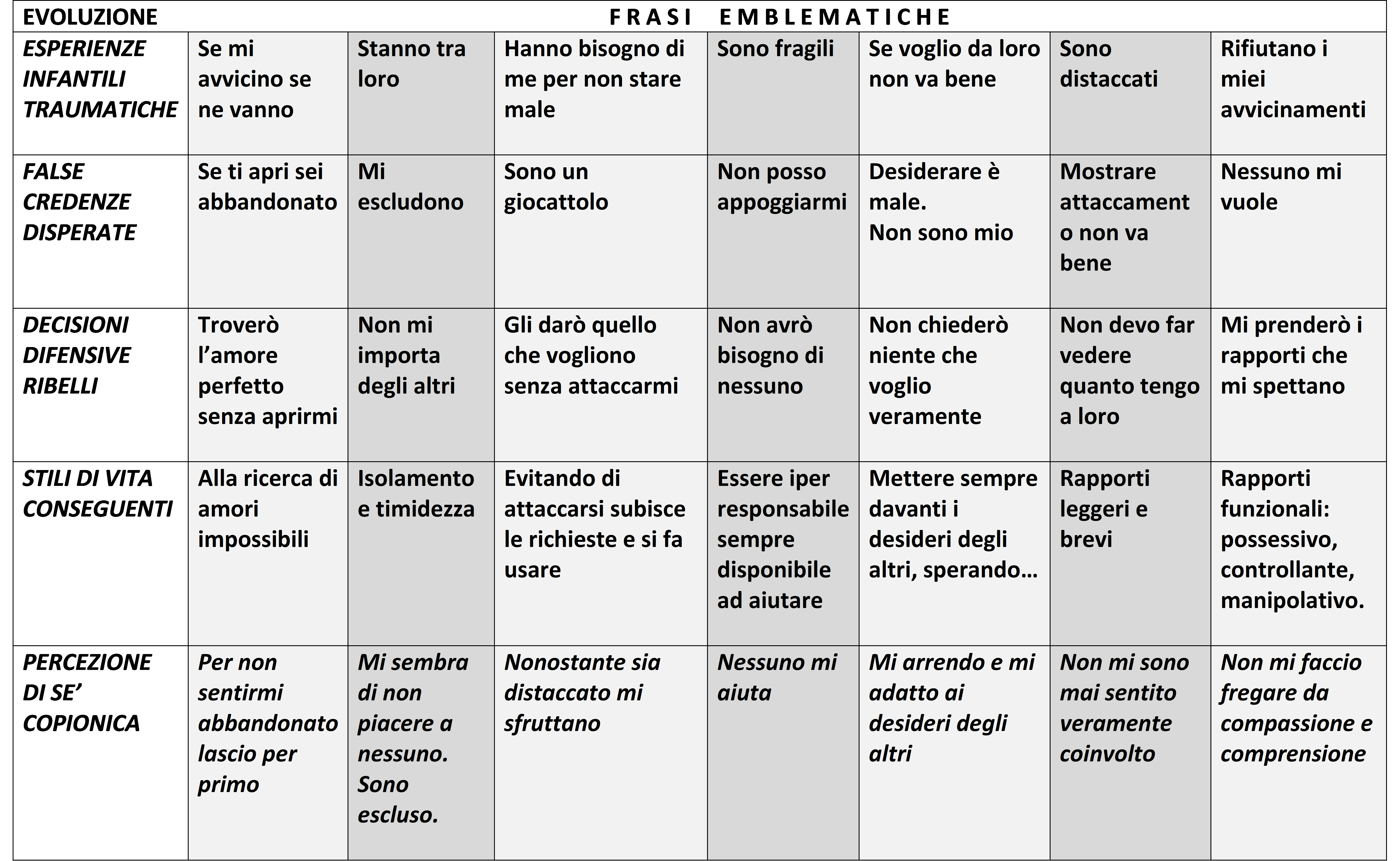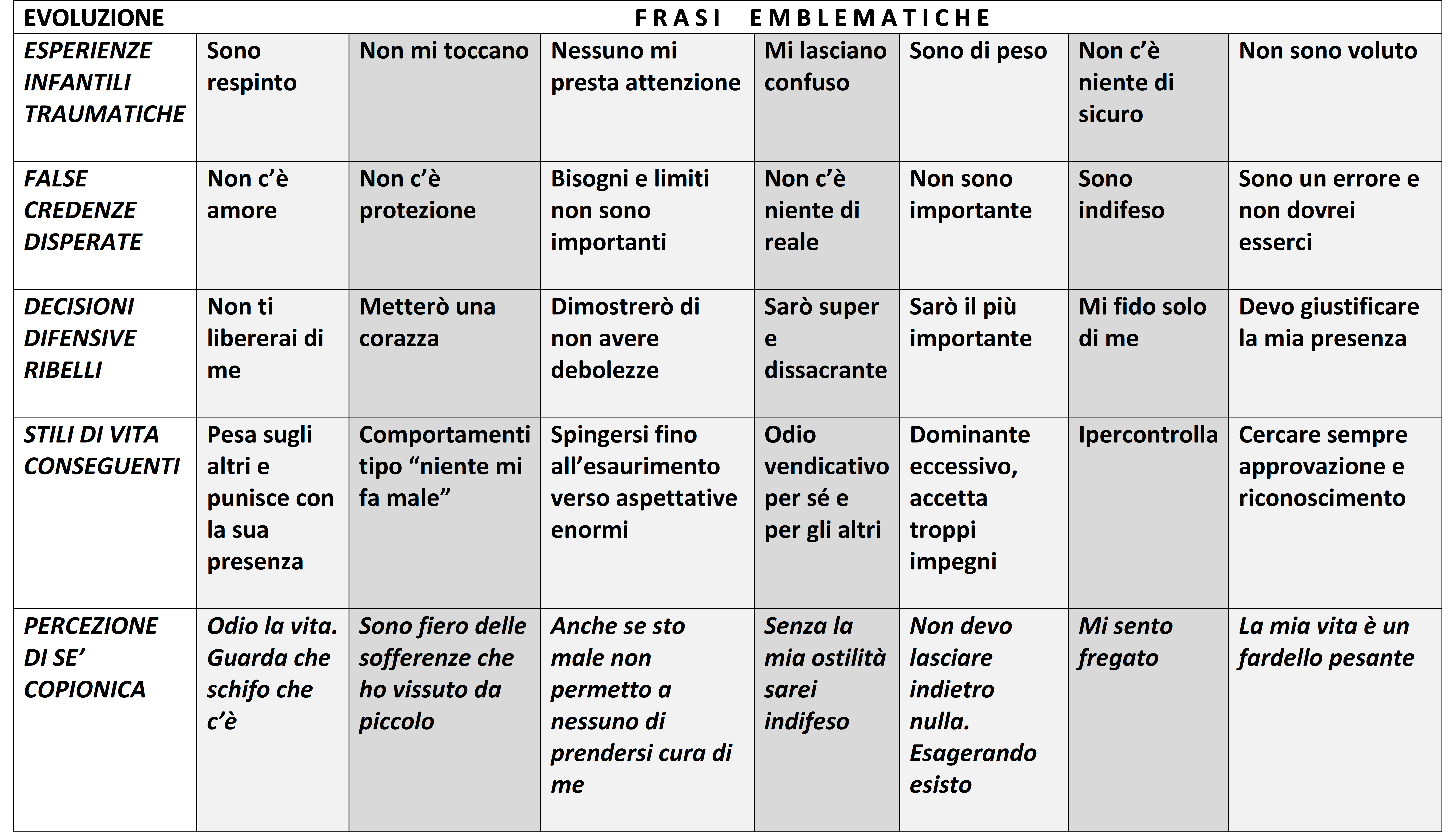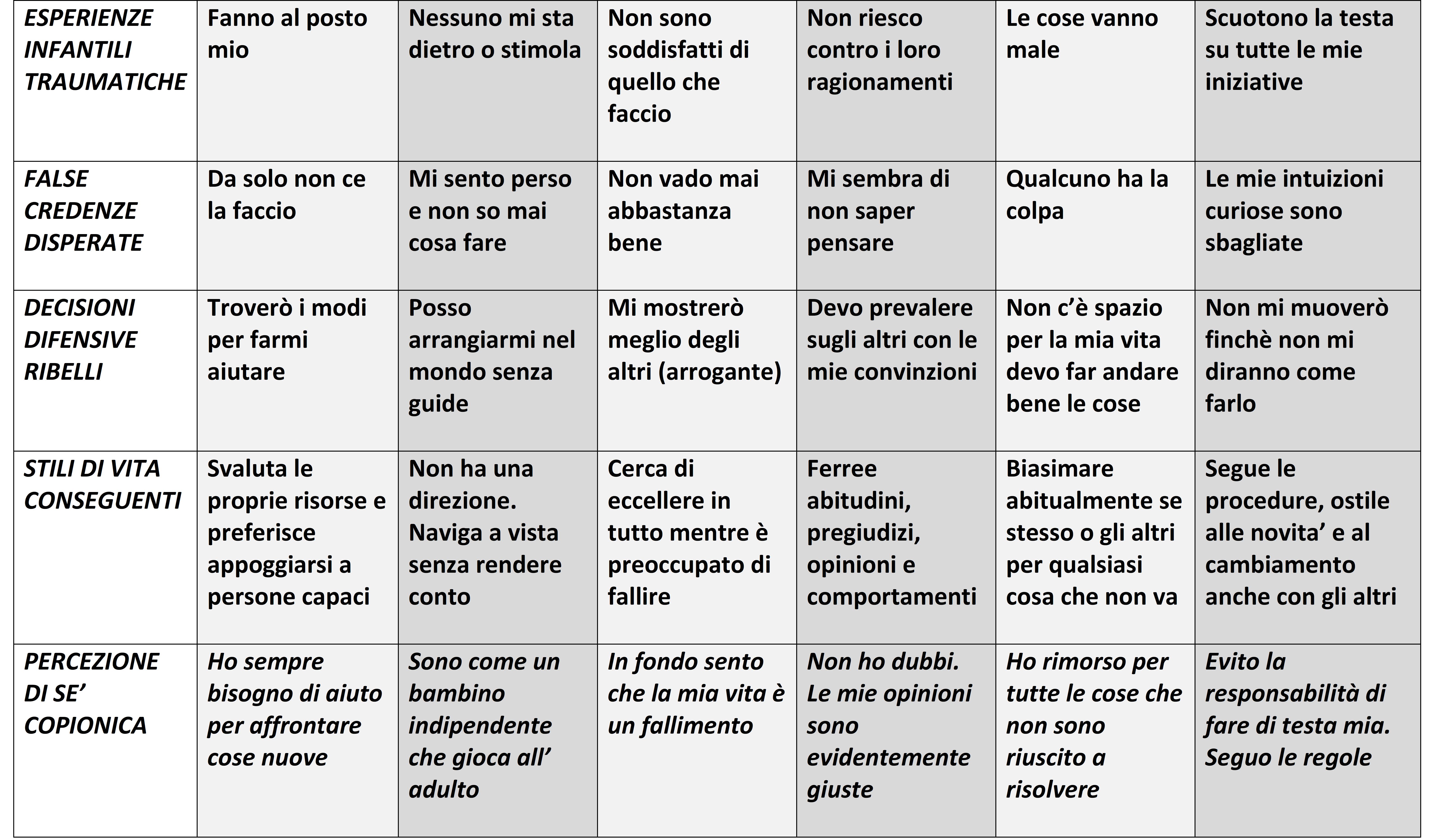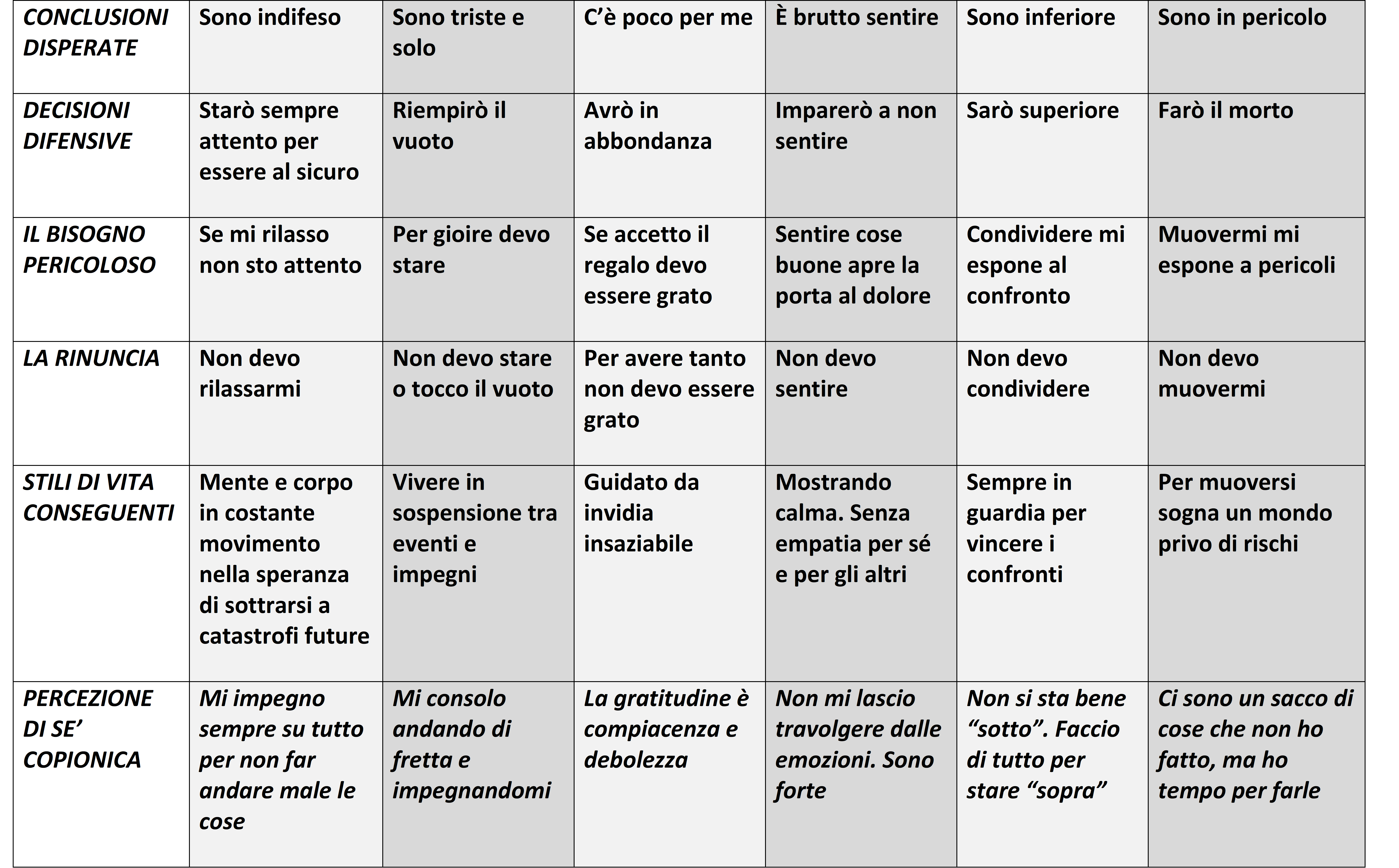 Ho messo questi esempi dopo quelli più infausti, legati alla sopravvivenza, proprio perché nella pratica spesso sono connessi. In questa tabella le frasi proposte nella “percezione di sé copionica” rendono bene l’idea dei vari modi in cui ci “difendiamo”.