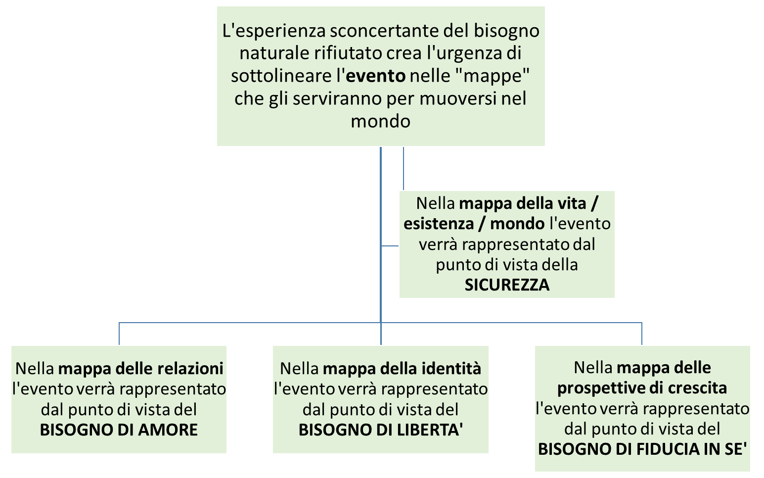 Esempio: Un bambino in ansia tende le braccia per essere preso in braccio. Avverte ostilità per questo. Questo evento può prendere senso in diversi modi. Da una parte in termini di SICUREZZA: “non posso contare sull’aiuto”. Dal punto di vista dell’AMORE: “Se chiedo si allontanano”. Dal punto di vista della identità (LIBERTA’): “non piaccio fragile”. Dal punto di vista della FIDUCIA in sé: “Non ce la faccio da solo”.