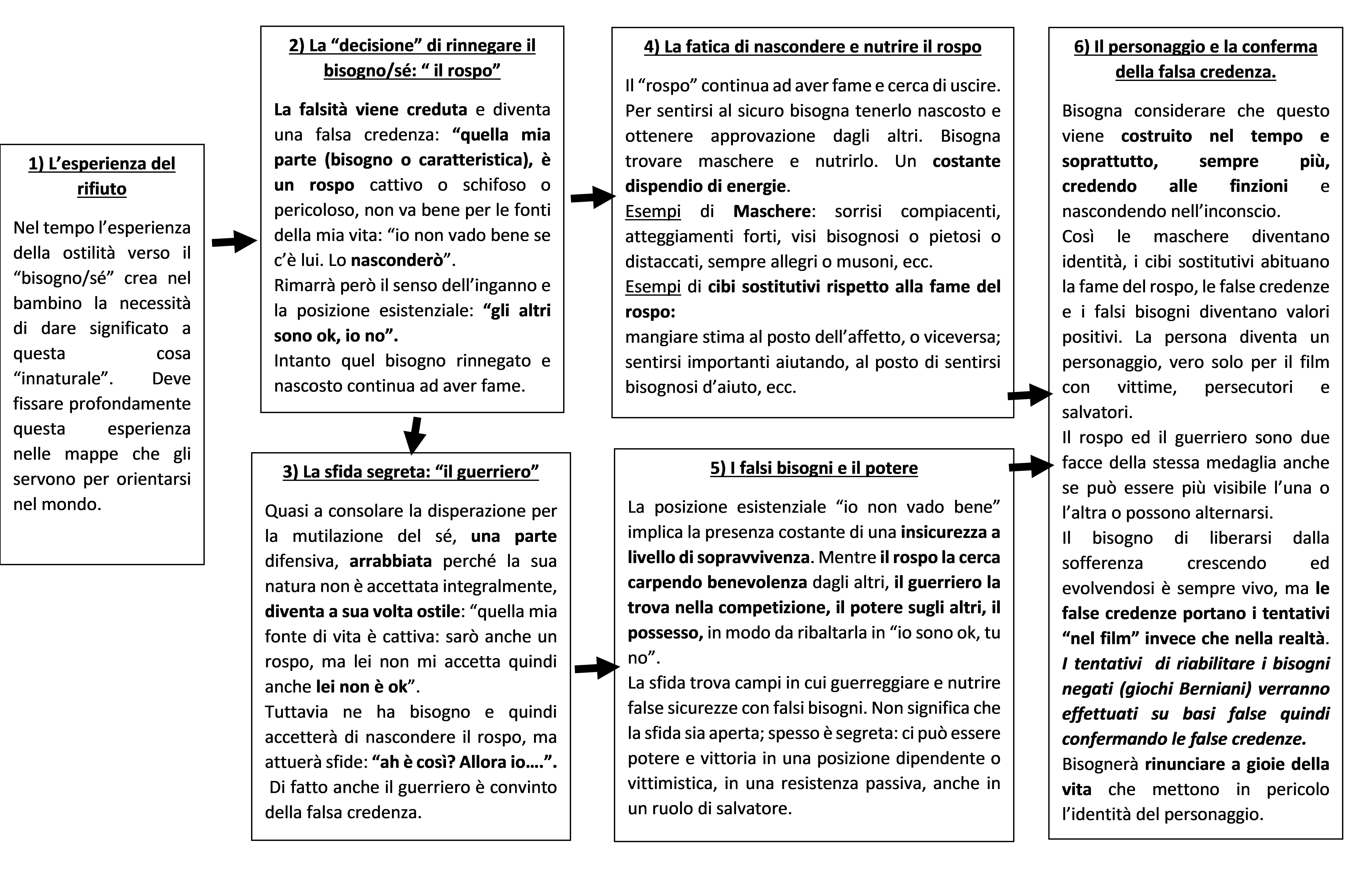 Nella prima parte ho fatto riferimento alle diverse aree pulsionali e agli istinti di sopravvivenza come ai motori della nostra vita. Abbiamo visto come da queste “energie” si differenzino nei primi anni di vita i bisogni più specifici. Ho individuato nella ostilità verso un bisogno il punto di partenza perché si formino false credenze che danno inizio al copione. Lo schema precedente mette in evidenza il processo. Non entra nel merito dei contenuti. Che forma prende questo processo se il bisogno rinnegato è x o y? Come cambia la “narrazione” del Film in base al contenuto della falsa credenza?